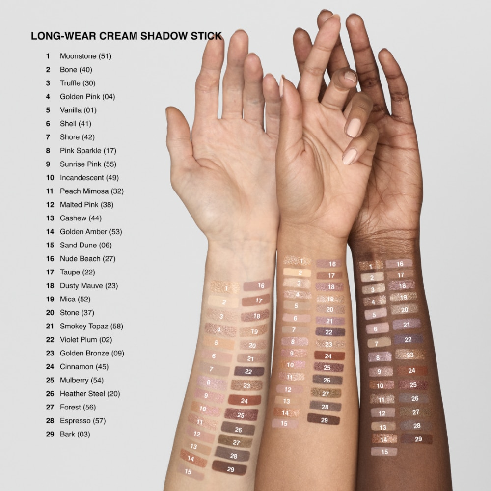 Ingredients: Trimethylsiloxysilicate, Hydrogenated Polyisobutene, Synthetic Wax, Isododecane, Polybutene, Ethylene/Propylene Copolymer, Simmondsia Chinensis (Jojoba) Seed Oil, Helianthus Annuus (Sunflower) Seed Oil, Silica Silylate, Copernicia Cerifera (Carnauba) Wax\ Copernicia Cerifera Cera \Cire De Carnauba, Pentaerythrityl Tetra-Di-T-Butyl Hydroxyhydrocinnamate, [+/- Mica, Titanium Dioxide (Ci 77891), Iron Oxides (Ci 77491), Iron Oxides (Ci 77492), Iron Oxides (Ci 77499), Black 2 (Ci 77266), Copper Powder (Ci 77400), Aluminum Powder (Ci 77000), Ultramarines (Ci 77007), Blue 1 Lake (Ci 42090), Manganese Violet (Ci 77742), Ferric Ammonium Ferrocyanide (Ci 77510), Bronze Powder (Ci 77400), Yellow 5 Lake (Ci 19140), Bismuth Oxychloride (Ci 77163), Chromium Hydroxide Green (Ci 77289), Chromium Oxide Greens (Ci 77288), Ferric Ferrocyanide (Ci 77510)]